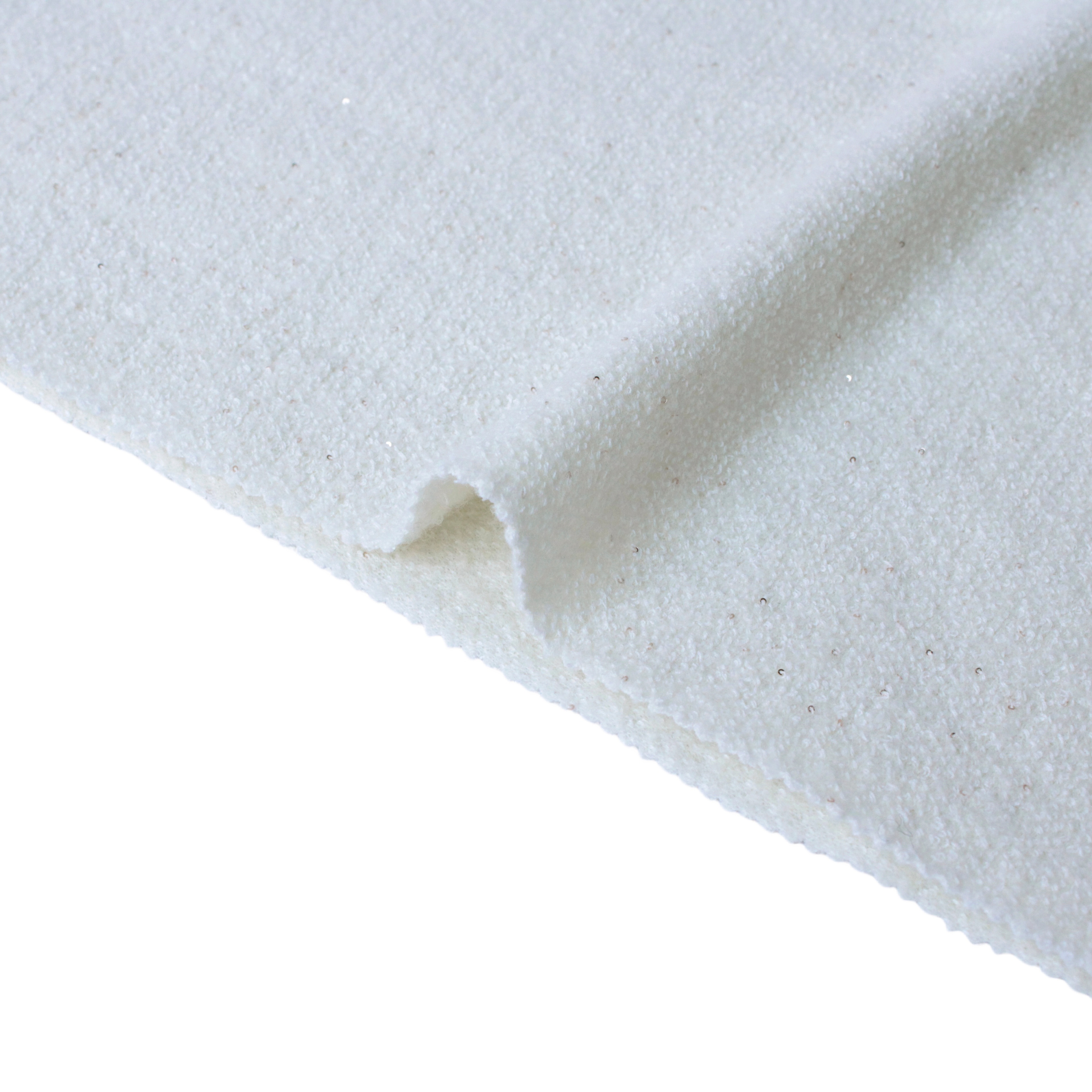 小さなゴールドのスパンコールが織りにシームレスに組み込まれており、クリームホワイトのベースを引き立てる繊細な全体的な輝きを生み出しています。